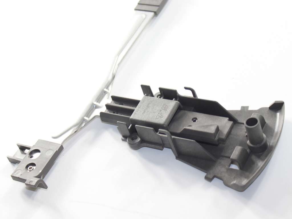 Removed broken part by removing three screws. Installed new part which is better quality. Supports are metal. Replaced three screws and put rack back on supports.